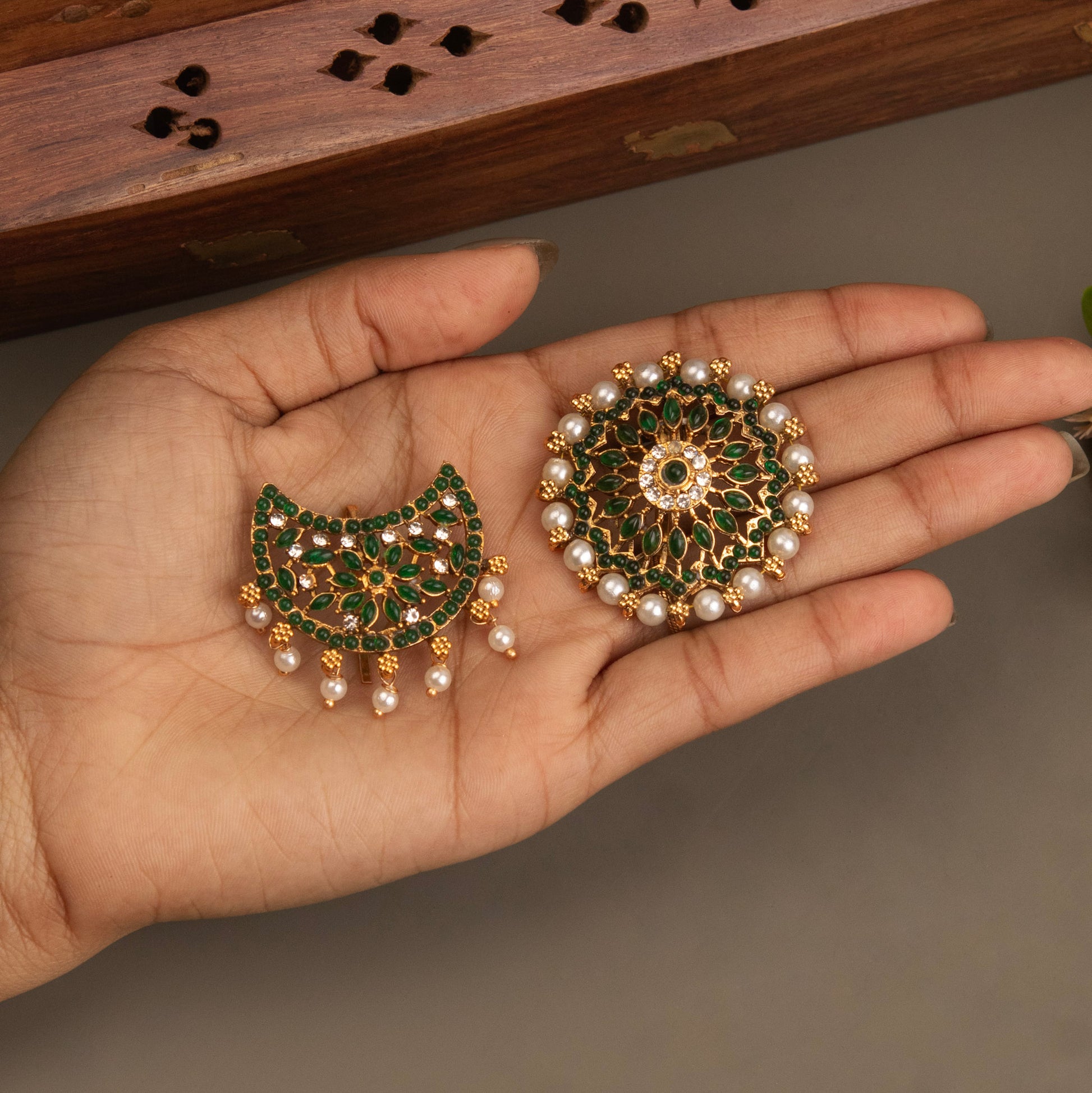 Elevate your traditional look with this exquisite Antique Hair Choti, a timeless accessory crafted for classical dancers and brides seeking authentic elegance. Featuring intricate Surya Chandra (sun and moon) motifs, this ornamental choti blends heritage craftsmanship with refined aesthetics. Perfect for Bharatanatyam performances, weddings, and festive celebrations, it adds a touch of classical grandeur to your ensemble. Each piece honors traditional design while complementing both contemporary and period styling. An investment in cultural beauty that transcends occasions.