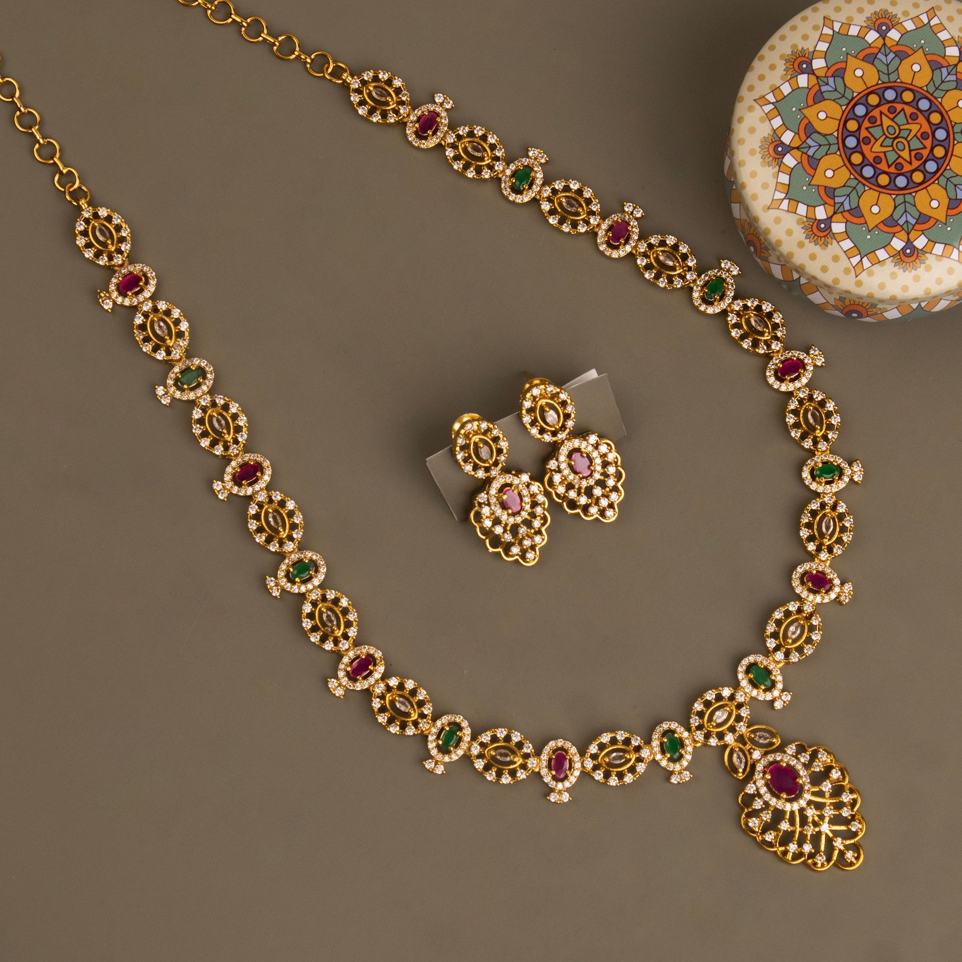 Embrace a timeless statement with this exquisite long-drop necklace in a luxurious gold-toned finish, inspired by the goddess of beauty and love. At its heart lies a series of finely crafted floral motifs, each set with brilliant AD-stone accents that catch the light with every movement. The elongated chain drapes gracefully, making this piece ideal for both traditional ethnic wear and modern contemporary ensembles.