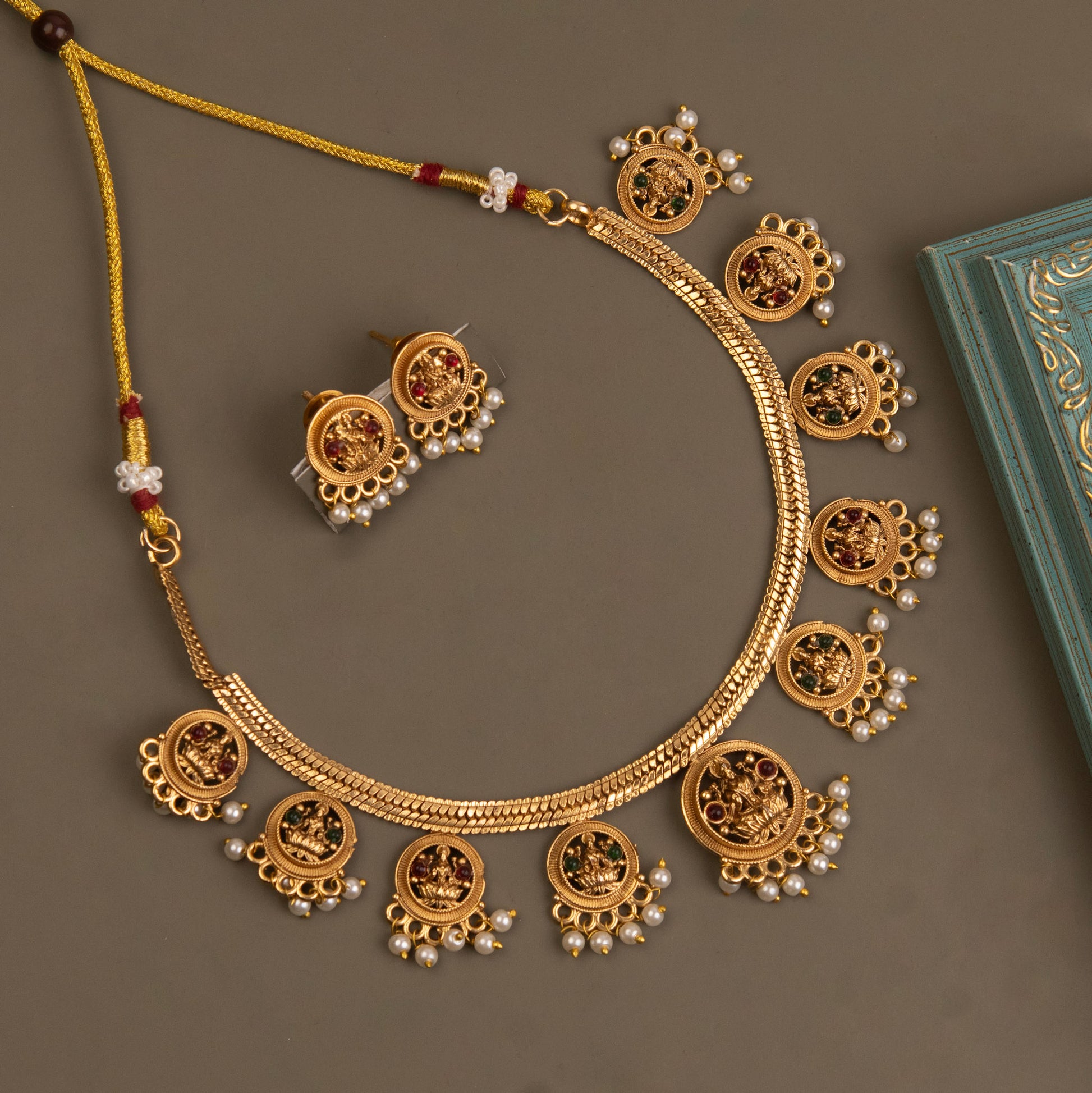Lekshmi with Coin Design Ruby Green Stone with White Pearls Necklace Celebrate timeless elegance with this exquisite Lekshmi necklace, featuring a striking coin design centerpiece adorned with rich ruby and verdant green stones. Lustrous white pearls frame the design, adding a touch of refined sophistication to this traditional piece. Perfect for festive occasions, weddings, or when you want to embrace your heritage with grace. This necklace seamlessly blends classic craftsmanship with premium materials, making it an heirloom-worthy addition to your jewelry collection.