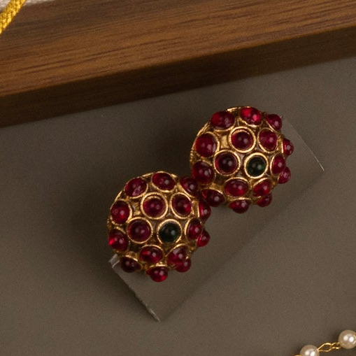 [Choker] Elevate your bridal ensemble with this exquisite white pearl choker, thoughtfully designed to frame the neckline with timeless elegance. The piece features a stunning ruby and green stone pendant that adds a pop of color and traditional charm. Perfect for weddings, festivals, or special occasions, this choker combines the purity of white pearls with vibrant gemstones to create a balanced, sophisticated look. The pendant's intricate detailing ensures you'll feel confident and radiant, whether worn alone or layered with other pieces.