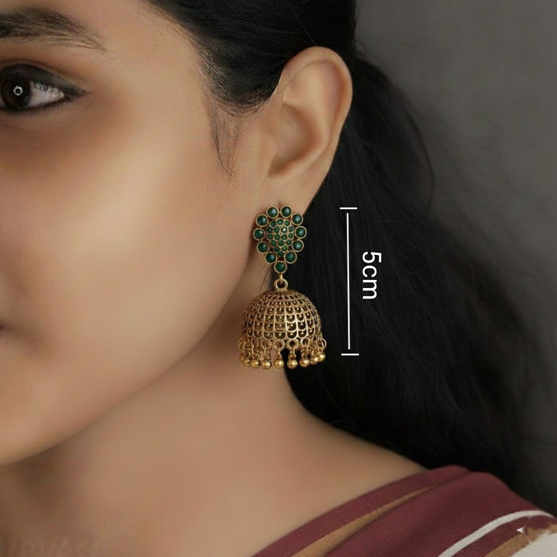 Oxidised Jhumka Earrings Embrace timeless elegance with these oxidised jhumka earrings, crafted to celebrate traditional Indian artistry. Featuring rich maroon and green stones set against an antique copper finish, each piece is adorned with warm copper-toned pearls that catch the light beautifully. The oxidised metal work adds authentic vintage charm, making these earrings perfect for festive occasions, weddings, or everyday wear that calls for understated luxury. A versatile addition to any jewelry collection that honors classic craftsmanship.